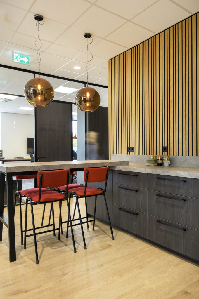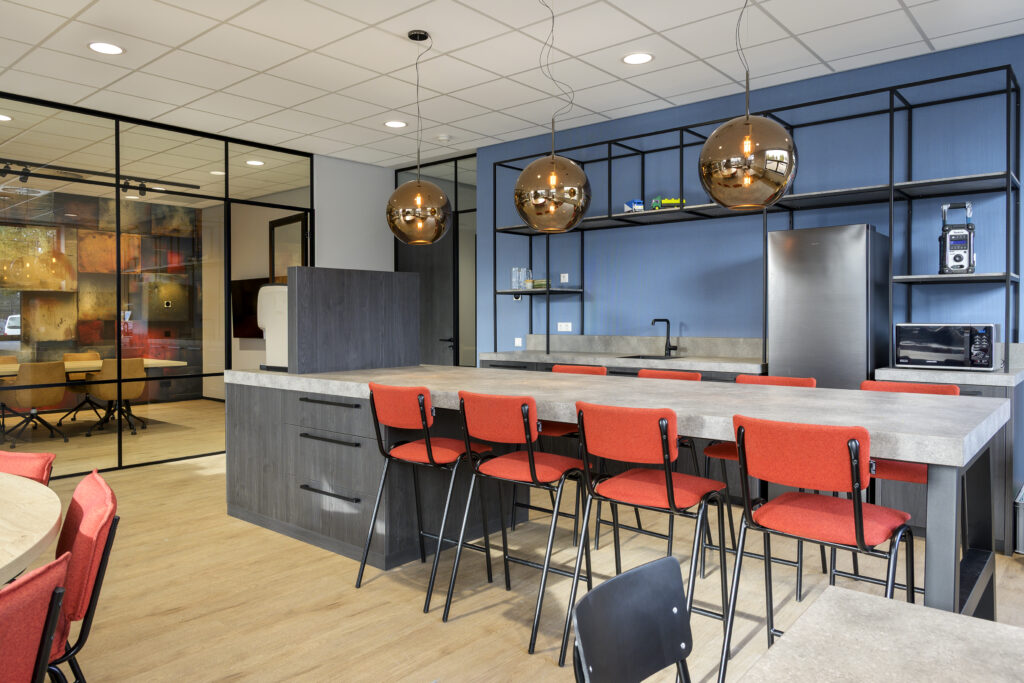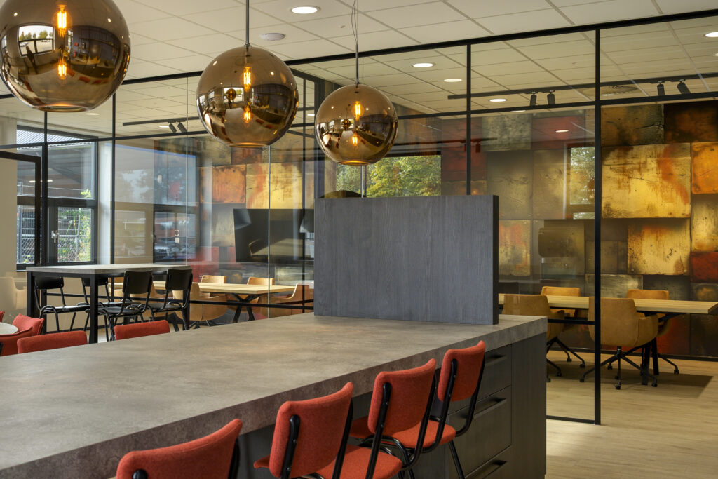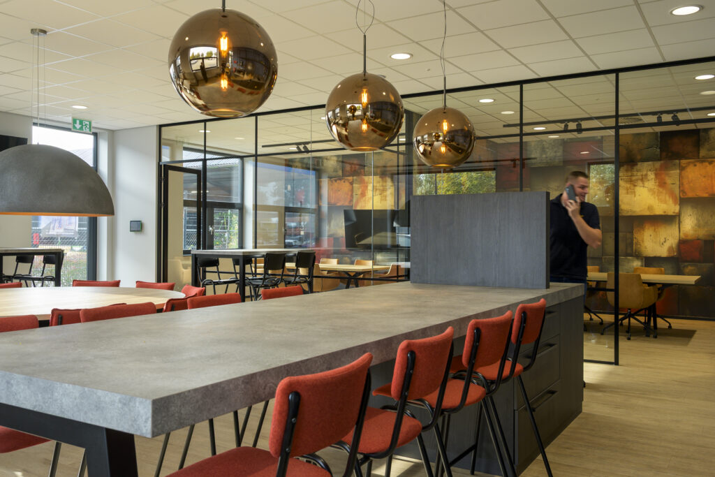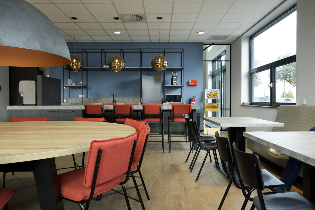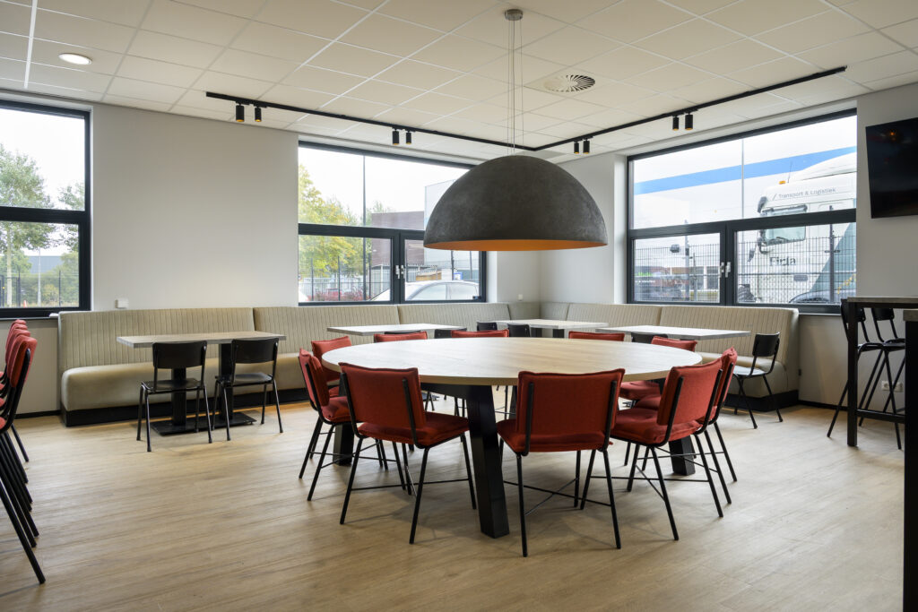 Kantine: voor de kantine inrichting is een treinbank op maat geplaatst. Voor de uitstraling is hier een verticale stiknaad in de rugleuning verwerkt. Daarnaast zijn de kleine kantinetafels in exact hetzelfde decor aangeleverd als de keuken, waardoor het een uniforme uitstraling heeft. Centraal in de kantine staat de op maat gemaakte ronde tafel met een doorsnede van wel 240cm. De rood gestoffeerde barkrukken zijn een kleine knipoog naar de huisstijl van Sijperda.